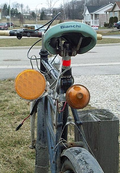 Here are my two commuter bikes; one for the winter and one for the summer. The orange reflector is a lot brighter than the red one!