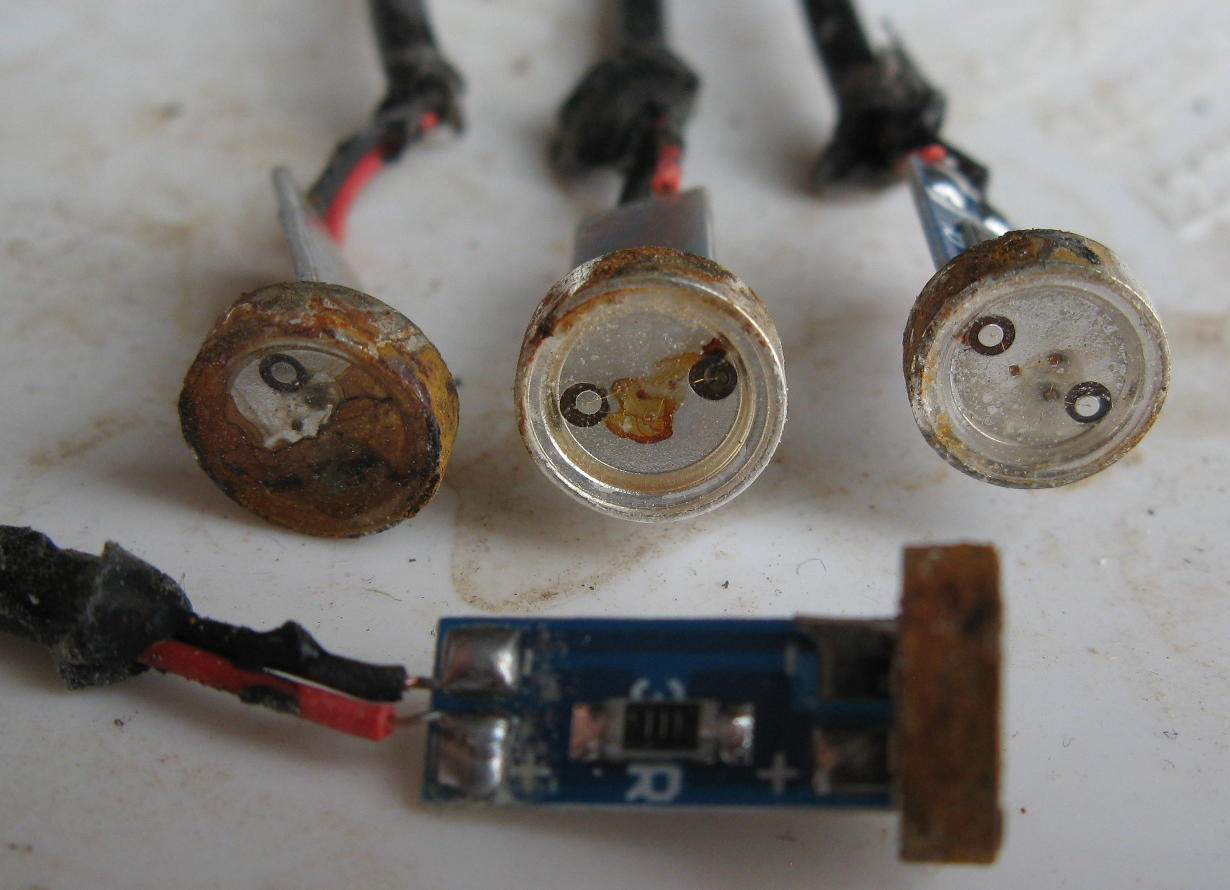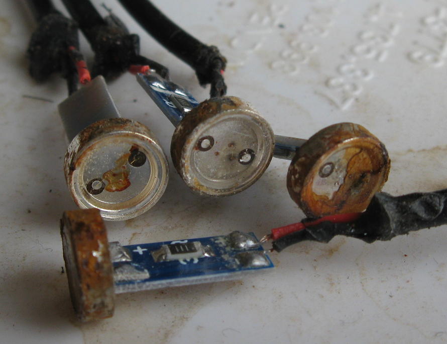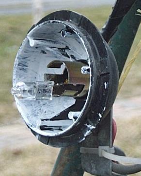 My tail light. First the original one and then a 10W halogen bulb soldered to the old connector with the plastic painted white for extra brightness.